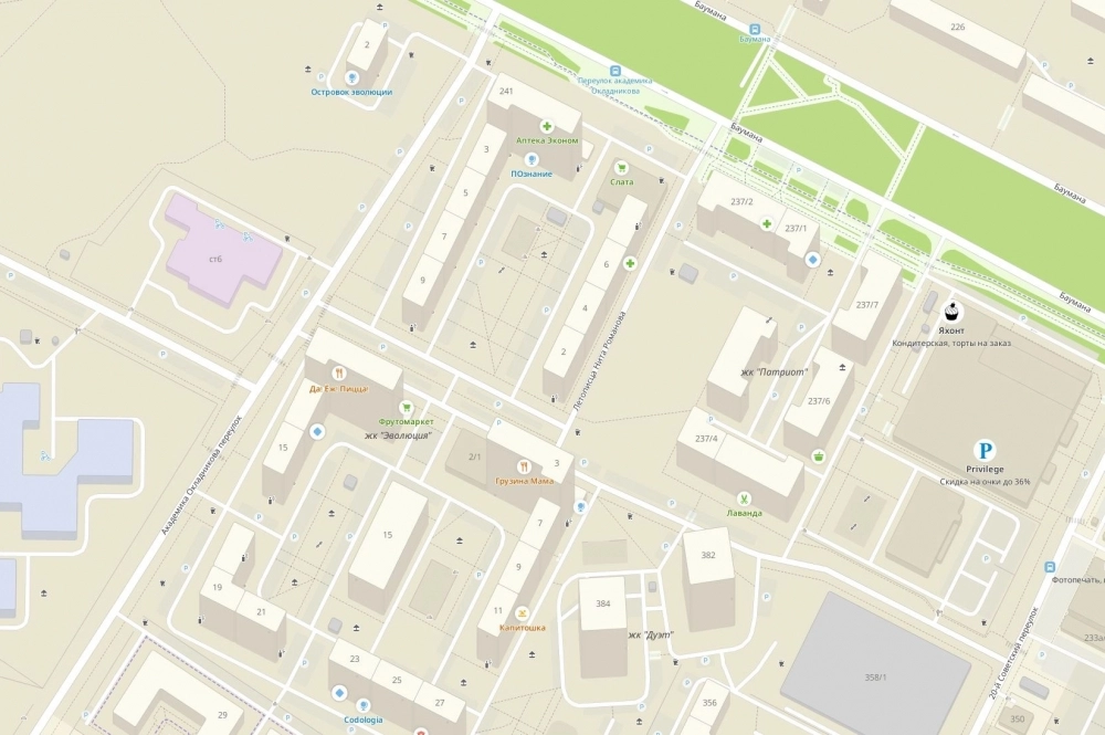 Судя по карте, ближайший к переулку Академика Окладникова торговый центр находится на улице Баумана. Рядом с ТЦ есть несколько аптек. В какой-то из них, вероятно, пытался спастись потерпевший.
