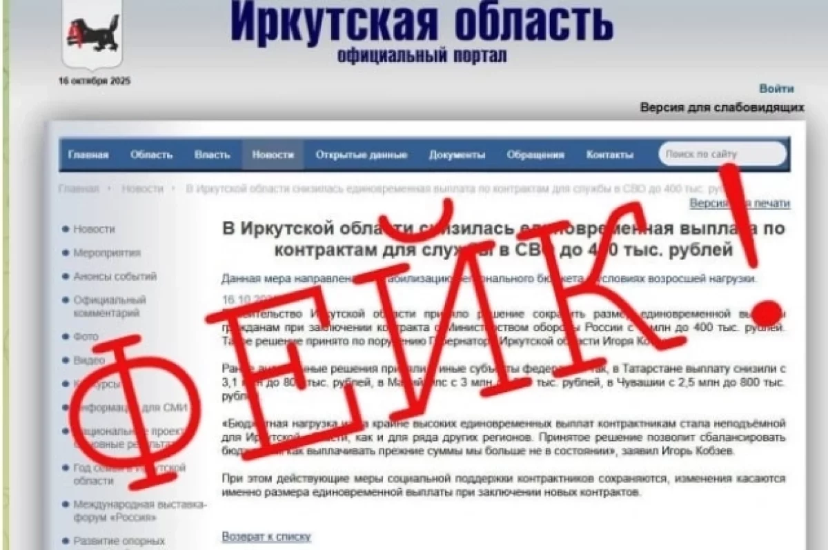 В этом сообщении говорилось, что единовременная денежная выплата для военнослужащих-контрактников уменьшается с 1 миллиона до 400 тысяч рублей. В качестве причины лжецы указали нехватку денег в областном бюджете. Источник дезинформации и лица, распространившие поддельный документ, остаются неустановленными