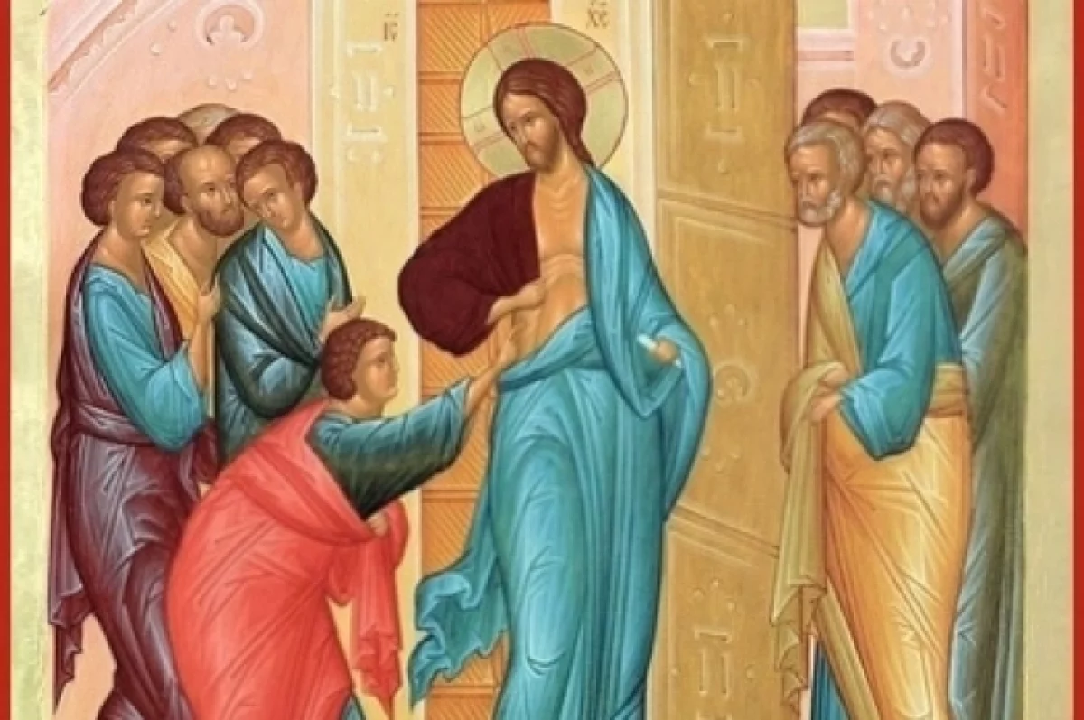 Крестная смерть Христа произвела на апостола Фому удручающее впечатление: он словно утвердился в убеждении, что утрата Его невозвратна. На уверения учеников о воскресении Спасителя он отвечал: «Если не увижу на руках Его ран от гвоздей и не вложу руки моей в рёбра Его, не поверю». На восьмой день после Воскресения Господь явился апостолу Фоме и, свидетельствуя о том, что был с учениками всё время по воскресении, показал ему Свои раны. Вера возгорелась в нём ярким пламенем, и он воскликнул: «Господь мой и Бог мой!» Этими словами Фома исповедал не только веру в Воскресение Христово, но и веру в Его Божество.