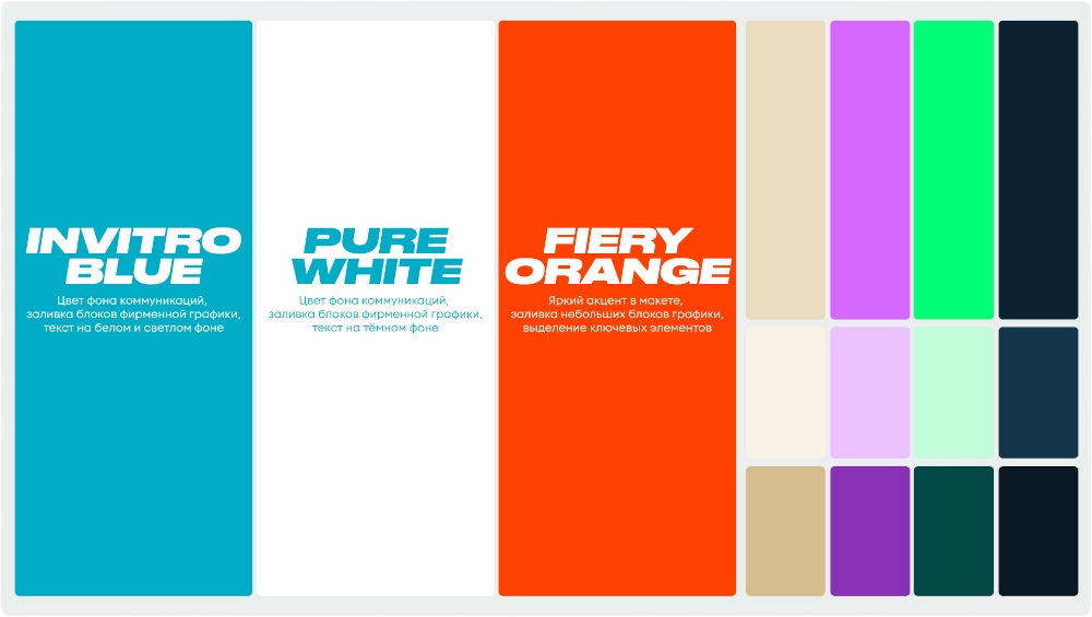 Медицинский рынок в коммуникациях и визуальном языке чрезвычайно консервативен. Нам было важно не только отстроиться от других компаний, но и стать новой точкой в эволюции образа медицины – быстрой, удобной и проактивной. Мы создавали стиль, который будет узнаваем без прямого упоминания бренда: так, помимо логотипа и обновления фирменных цветов, появились фреймы, собственный шрифт, фирменные фотостиль, графика и иллюстрации. В каждом из элементов можно проследить гибкость и динамику», - комментирует Дарья Колесникова, креативный директор ИНВИТРО.