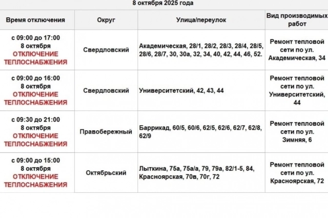 «Будет ограничено горячее водоснабжение для проведения ремонтных работ на тепловой сети по улицам Академическая, 34, Зимняя, 6, Красноярская, 72, в микрорайоне Университетский, 64», — написал оператор.
