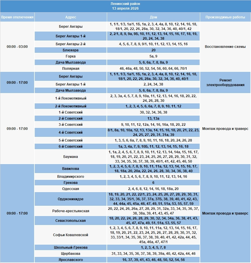 «13 апреля в некоторых домах Иркутска будет ограничено электроснабжение для проведения плановых работ, — уточняют в группе. — Возможны корректировки при влиянии метеоусловий и выявлении дефектов на оборудовании. Приносим извинения за доставленные неудобства».