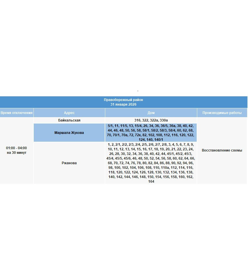 Отключение света в Иркутске произойдет 31 января. Электричества не будет в части домов по улицам 1-й Ленинский квартал, Кирзаводская, Томсона, Байкальской, Маршала Жукова, Ржанова, Белинского, Герцена, Гоголя, Жуковского, Звездинской, Клары Цеткин, Колхозной, Профсоюзной, Пушкина, Челнокова, Чернышевского, Шмидта.