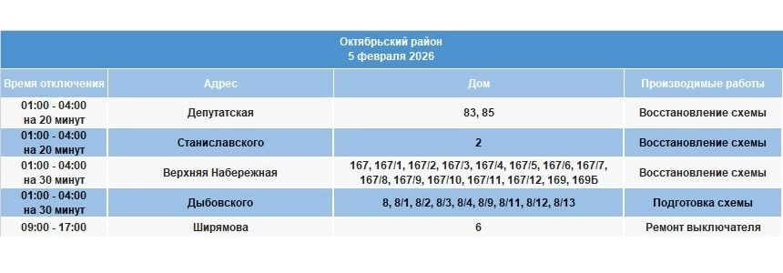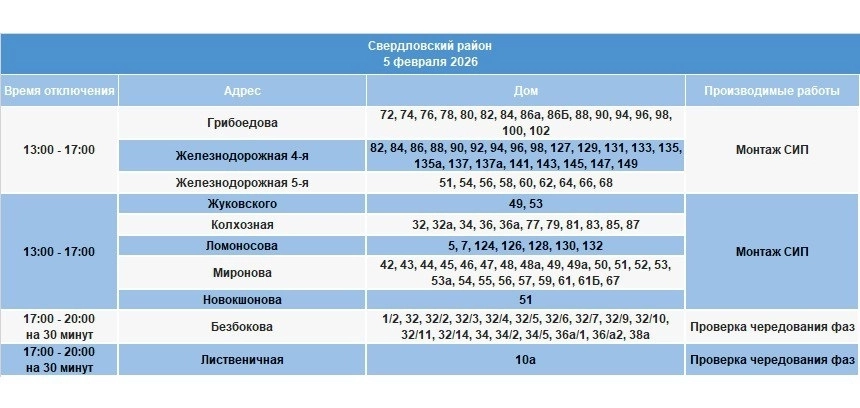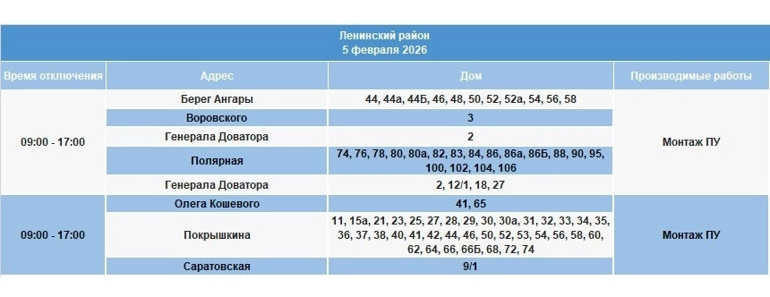 Длительные отключения электроэнергии 5 февраля в Иркутске ожидаются в домах по улицам Берег Ангары, Воровского, Генерала Доватора, Полярной, Олега Кошевого, Покрышкина, Саратовской, Ширямова, Авиаторов, Ипподромной, Култукской, Советской, Грибоедова, Железнодорожной 4-й и 5-й, Жуковского, Колхозной, Ломоносова, Миронова, Новокшонова.