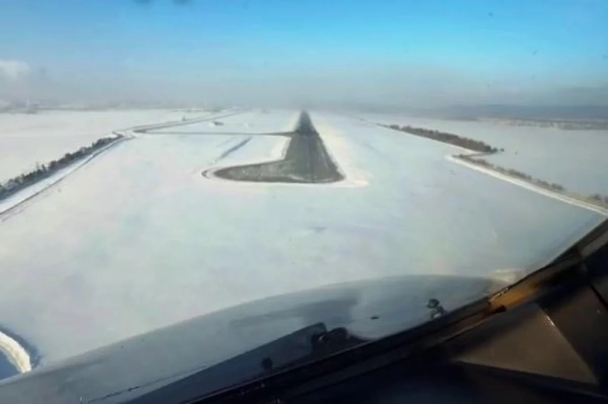 В объектив попали заснеженные просторы, густой сибирский лес и яркое голубое небо, открывающиеся при заходе на посадку. Видео завершается моментом касания взлётно-посадочной полосы.
