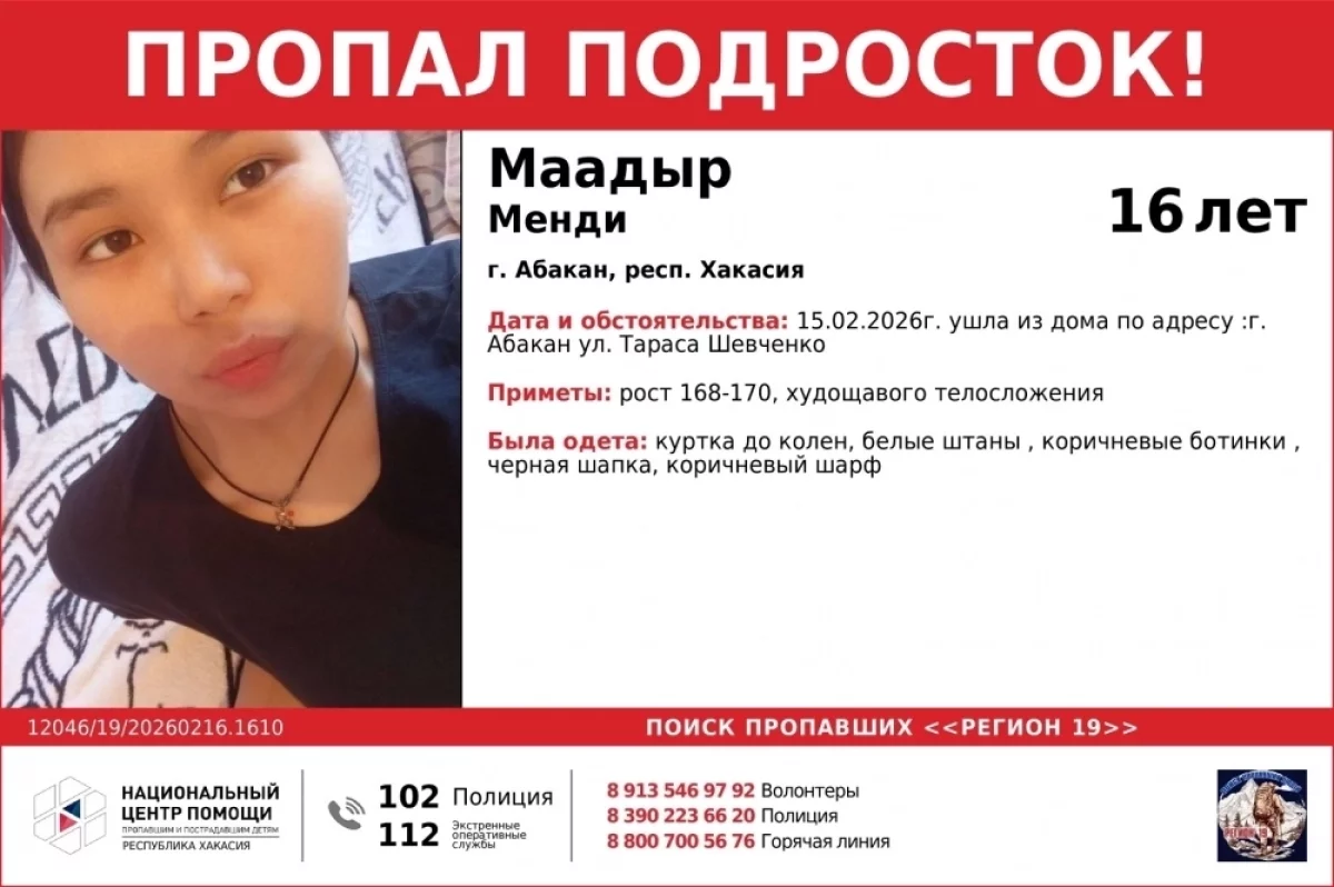 В Абакане пропала 16-летняя Маадыр Менди. Как пишут в группе по поиску пропавших людей, девушка ушла из дома 15 февраля и не вернулась. Приметы: рост 168-170 см, худощавое телосложение. Была одета в белые штаны, черную шапку, коричневый шарф, куртку до колен, коричневые ботинки.