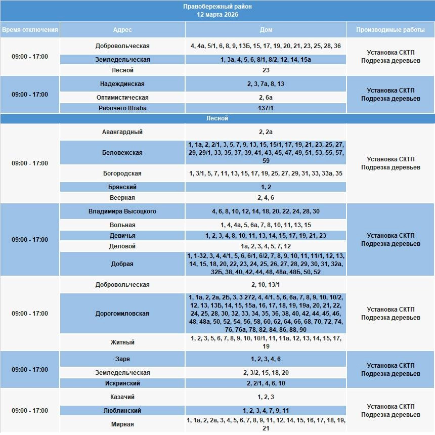 Электричества не будет на многих улица, среди которых Красных Мадьяр, 25 Октября, Седова, Комсомольская, Коммунистическая, Пискунова, Беловежская, Добрая, Дорогомиловская, Преображенская и другие.