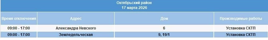 В Октябрьском районе отключения пройдут в некоторых домах на улицах Александра Невского и Земледельческой.