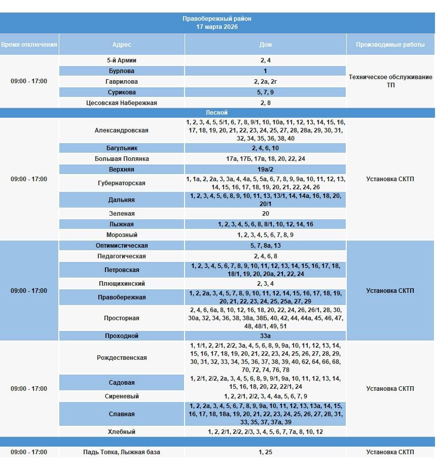 В Правобережном районе отключения будут в некоторых домах на улицах 5-й Армии, Булова, Гаврилова, Сурикова, Цесовской Набережной.