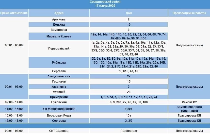 В Свердловском районе отключения пройдут в некоторых домах на улицах Аргунова, Боткина, Вампилова, Маршала Конева, Рябикова, Академической и других. СНТ Садовод будет отключено полностью.