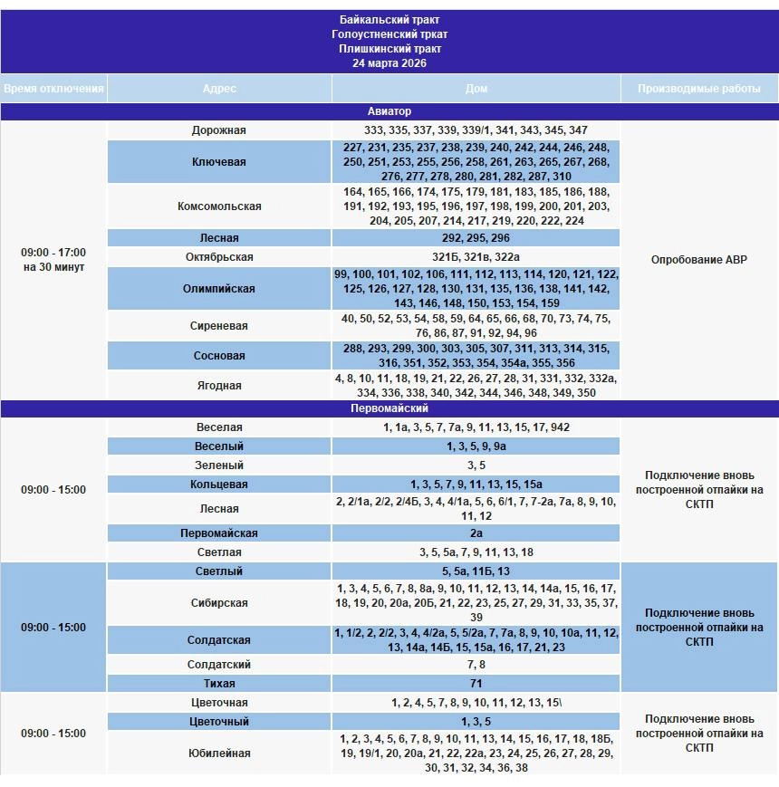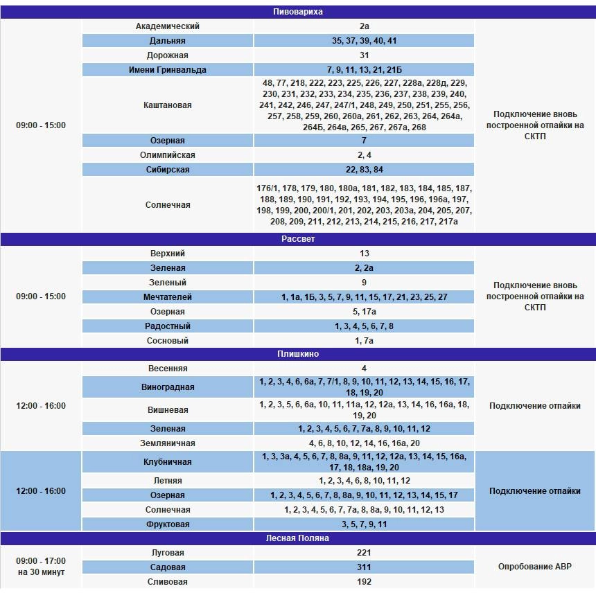 Отключение света пройдёт на части улиц села Пивовариха, в Рассвете, Плишкино, Лесной Поляне, а также в ДНТ Авангард.