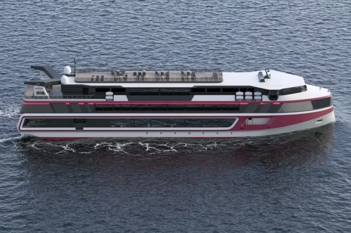 Длина судна составит около 70 метров, ширина — 15,5 метров. Три электродвигателя мощностью 1200 кВт помогут развить скорость до 20 км в час. Автономность плавания — до семи суток. На борту предусмотрены комфортабельные каюты, ресторан, кафе-бар, СПА-зона, детская игровая комната, смотровые площадки и солнечная палуба.