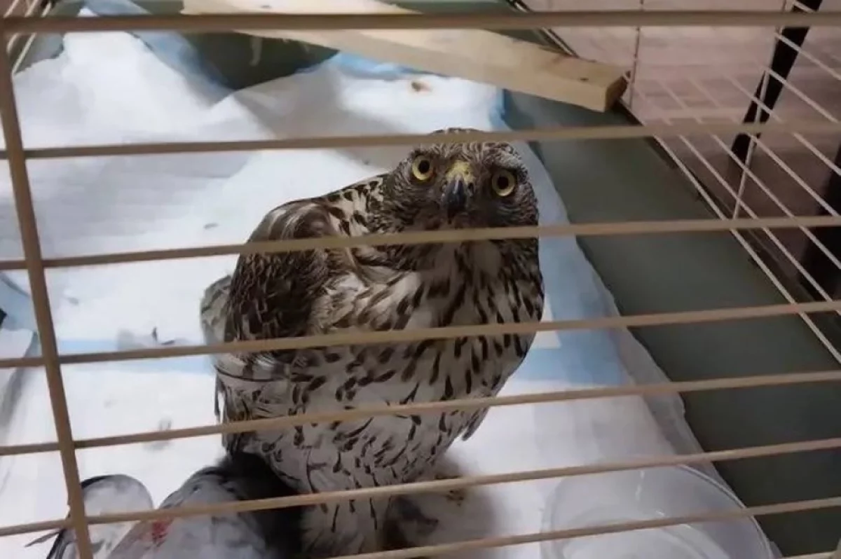 В Усть-Куте ветеринары спасли ястреба-тетеревятника. В погоне за голубями хищная птица залетела на склад одного из предприятий и врезалась в металлическую сетку-рабицу.